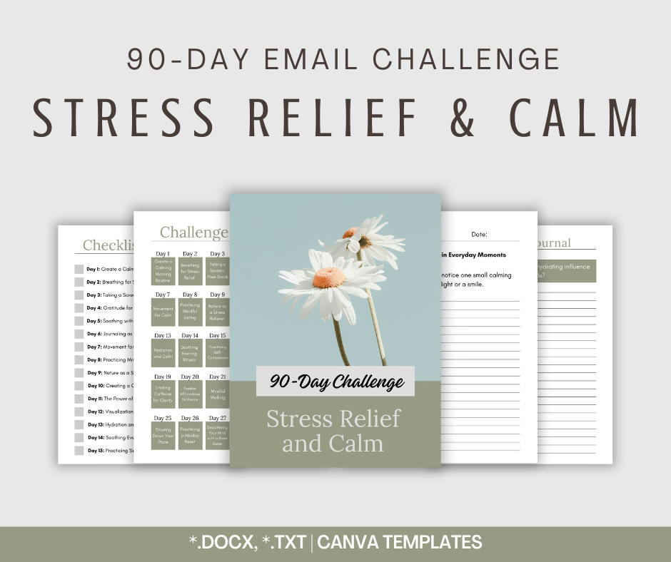 You will get a Stress-Relief and Calm Challenge Workbook that you can customize, convert to PDF, and have your readers print out to be used with this 90-day challenge.