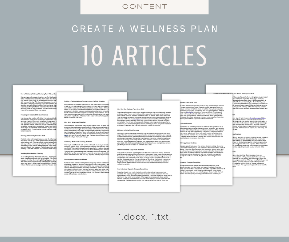 - Articles: 10 Articles About Creating a Wellness Plan (Microsoft Word and Text)