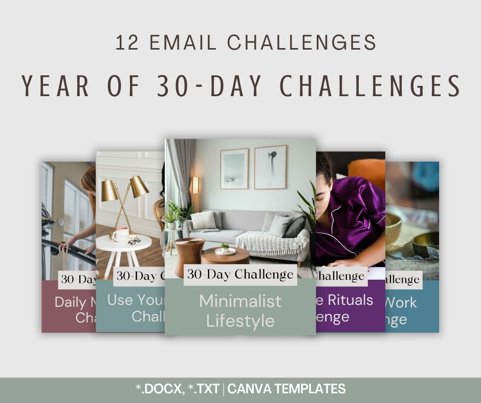 Each of these 12 challenges includes 30 emails, a challenge workbook, challenge journal (with the 30 journal prompts) and eCovers.